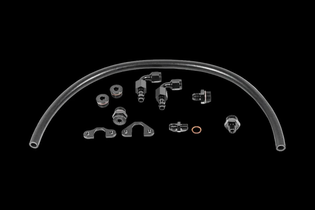 The plumbing kit includes the items shown. It allows an easy connection to the factory feed with a 6AN hose. It is intended to be used with the factory fuel pressure regulator (FPR), however, an aftermarket FPR can be used instead. The kit Includes 2 different FPR adapters compatible with all OEM Honda FPRs. Plugs are provided as well for any unused fuel rail ports.